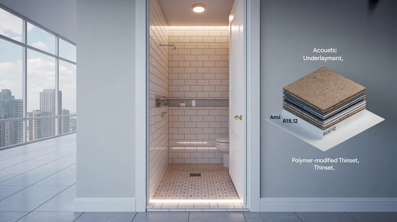 - Material specifications for all spaces: porcelain with DCOF ≥ 0.42, PEI 4-5 in kitchens, epoxy grout application in wet areas, and acoustic underlay materials where required.